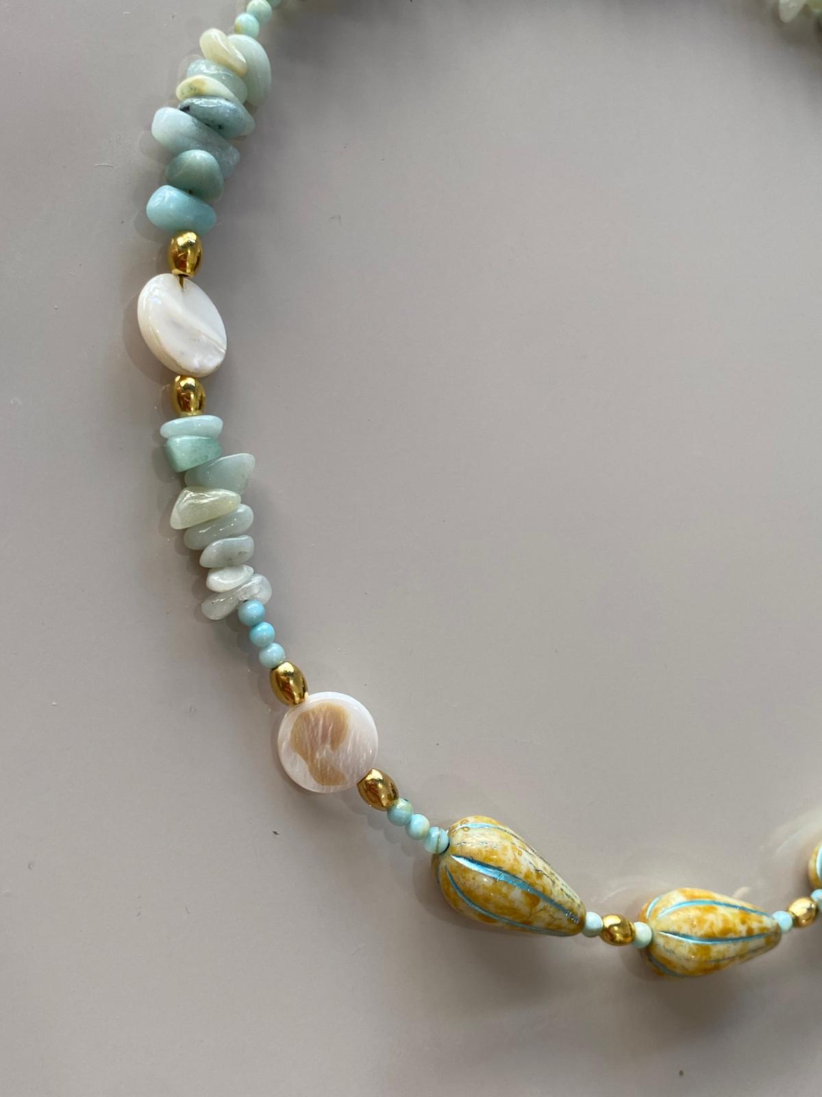 El Collar Amazonita combina la frescura de las piedras naturales con un diseño delicado y equilibrado. Está elaborado principalmente con chips de amazonita en tonos celeste suave y verde agua, característicos de esta piedra semipreciosa que transmite tranquilidad y armonía.