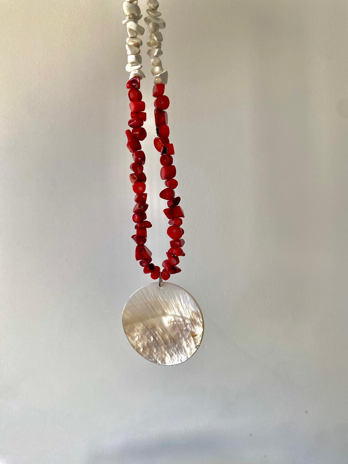 El Collar Nácar combina colores vibrantes con un colgante natural y luminoso. Está elaborado con dos tiras de piedras en forma de chips: una en tonos rojo coral intenso y otra en blanco perlado, creando un contraste fresco y llamativo.