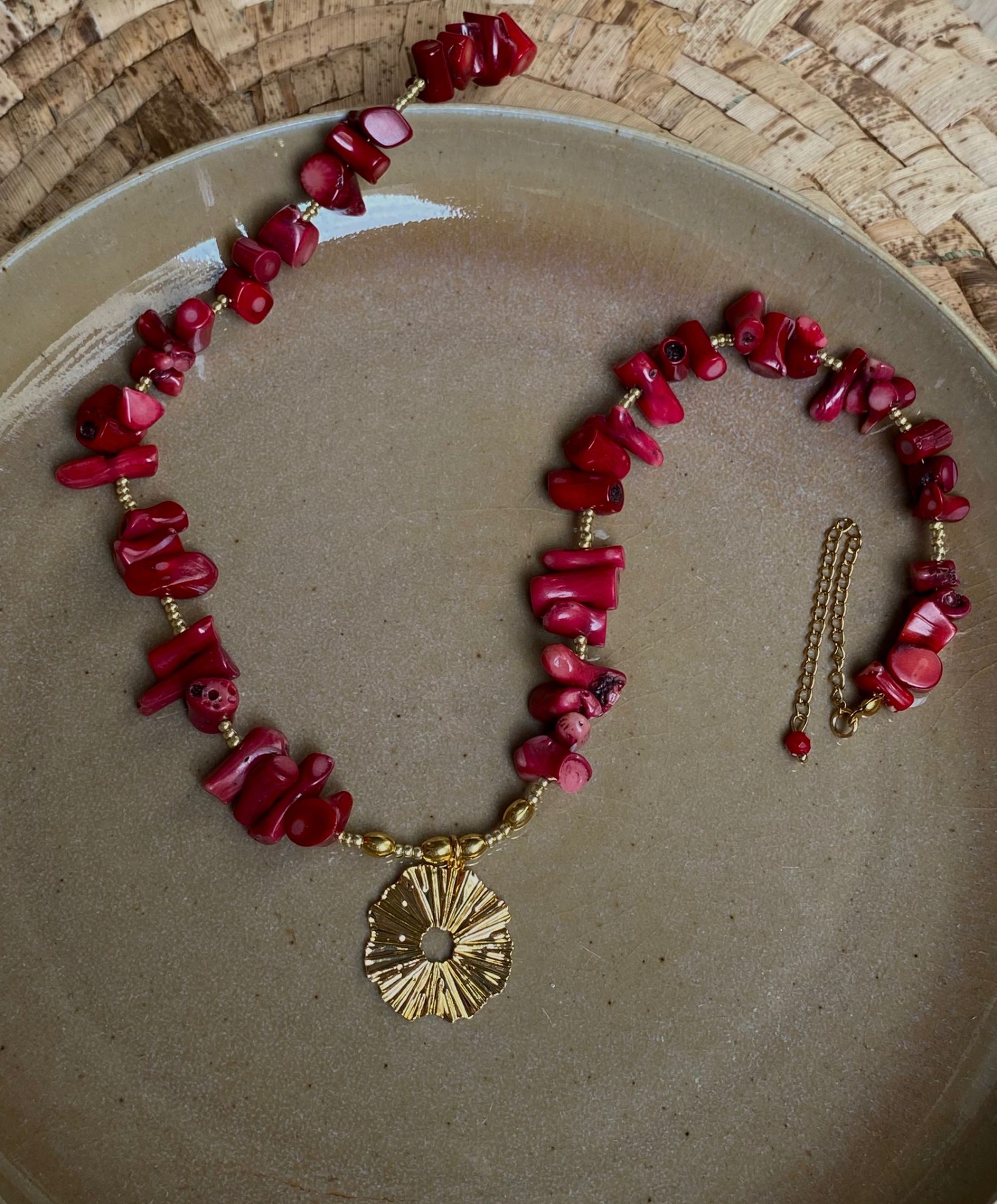 Collar artesanal formado por piedras rojas irregulares que aportan fuerza y textura, combinadas con detalles dorados que elevan el diseño. En el centro destaca un dije dorado con relieve, que suma brillo y un aire sofisticado. Una pieza vibrante y llamativa, ideal para realzar cualquier look.