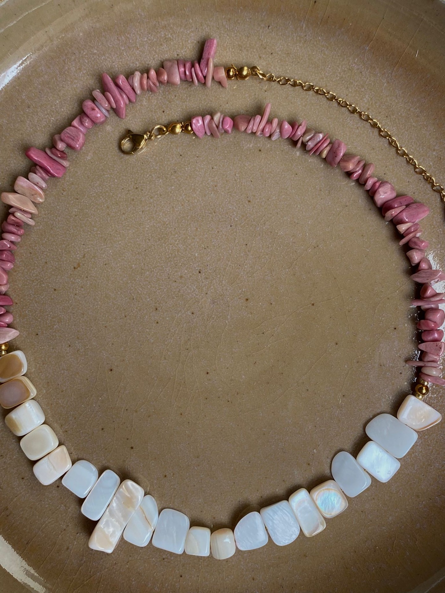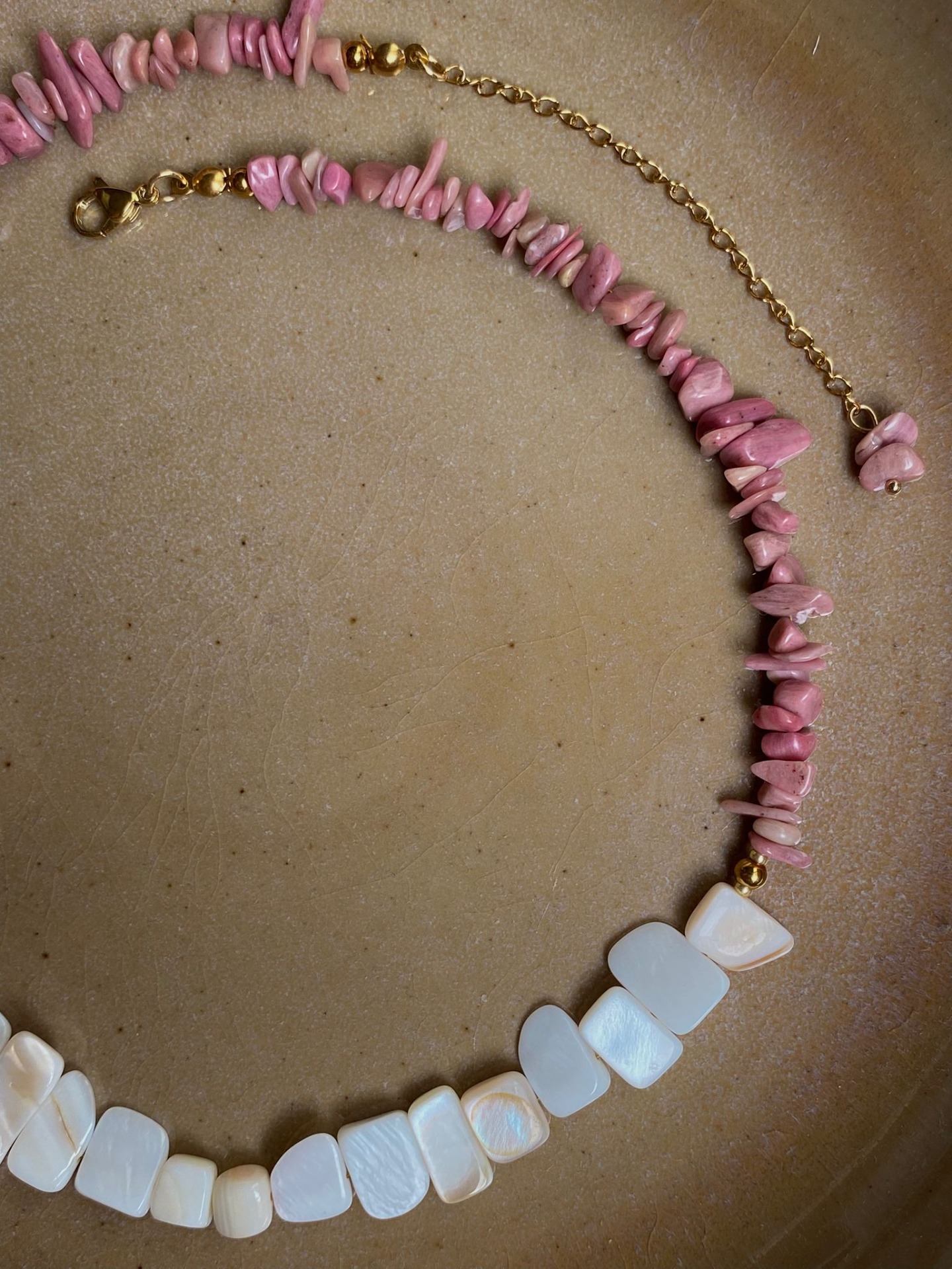 Collar artesanal combinado con piezas nacaradas y piedras "redonditas" en forma irregular, creando un contraste suave y elegante. Un diseño delicado que destaca por su mezcla de texturas y colores naturales.